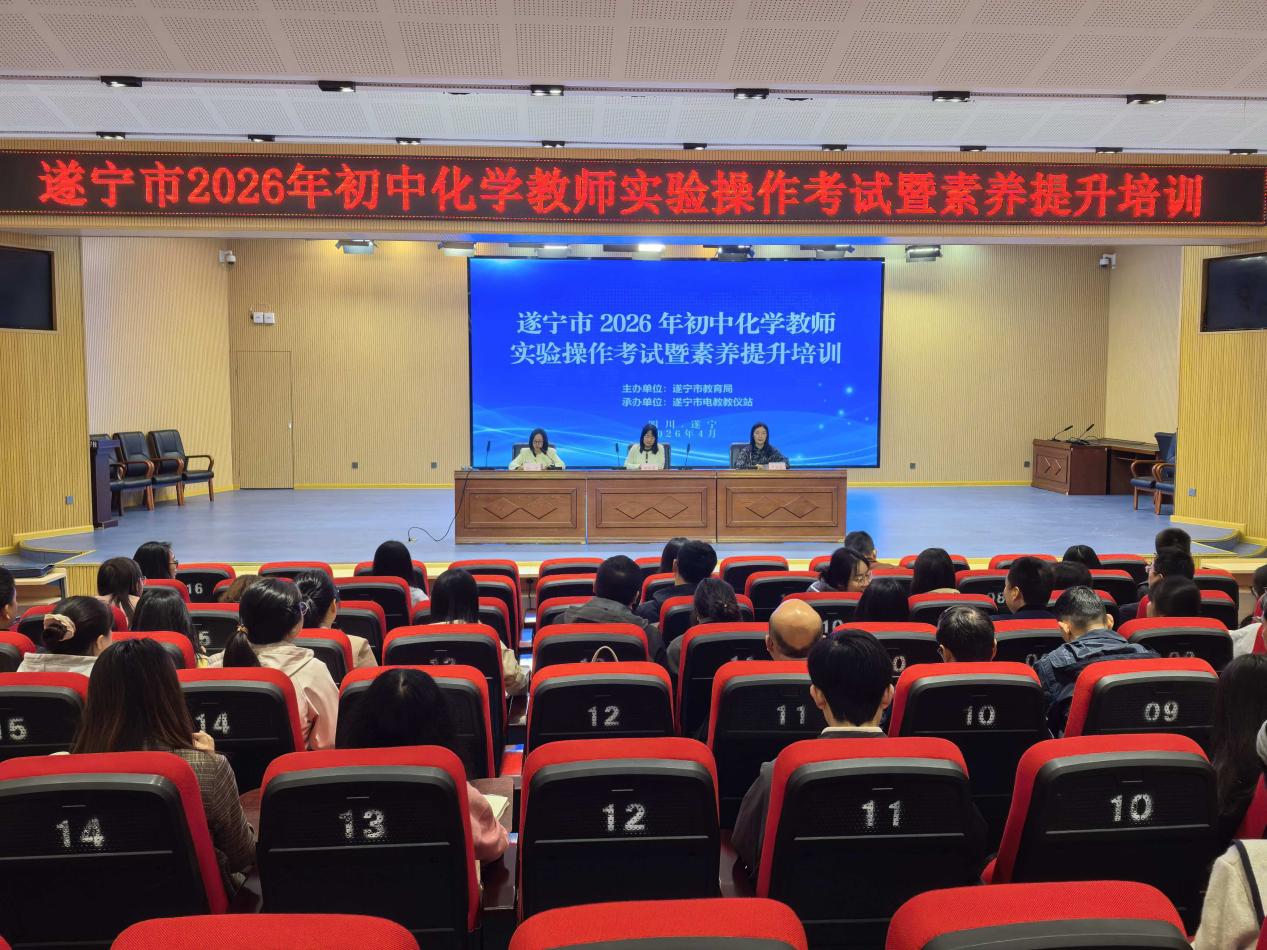 春和景明,万物竞发。近日,由遂宁市教育局主办的“2026年初中化学教师实验操作考试暨素养提升培训班”在遂宁高级实验学校顺利举行。来自全市各县(市、区)、市直园区及市直属学校的初中化学骨干教师、领队及工作人员共70余人参加培训。本次培训采取“以赛促训、理论+实操双轮驱动”的模式,力求学以致用、训有实效。四川师范大学化学与材料科学学院院长伍晓春教授应邀作专题讲座。内容涵盖大学本科阶段有机化学、无机化学、分析化学及课程教学论等内容,帮助教师拓宽学术视野、提升理论素养,为实验教学提供坚实的学科支撑。