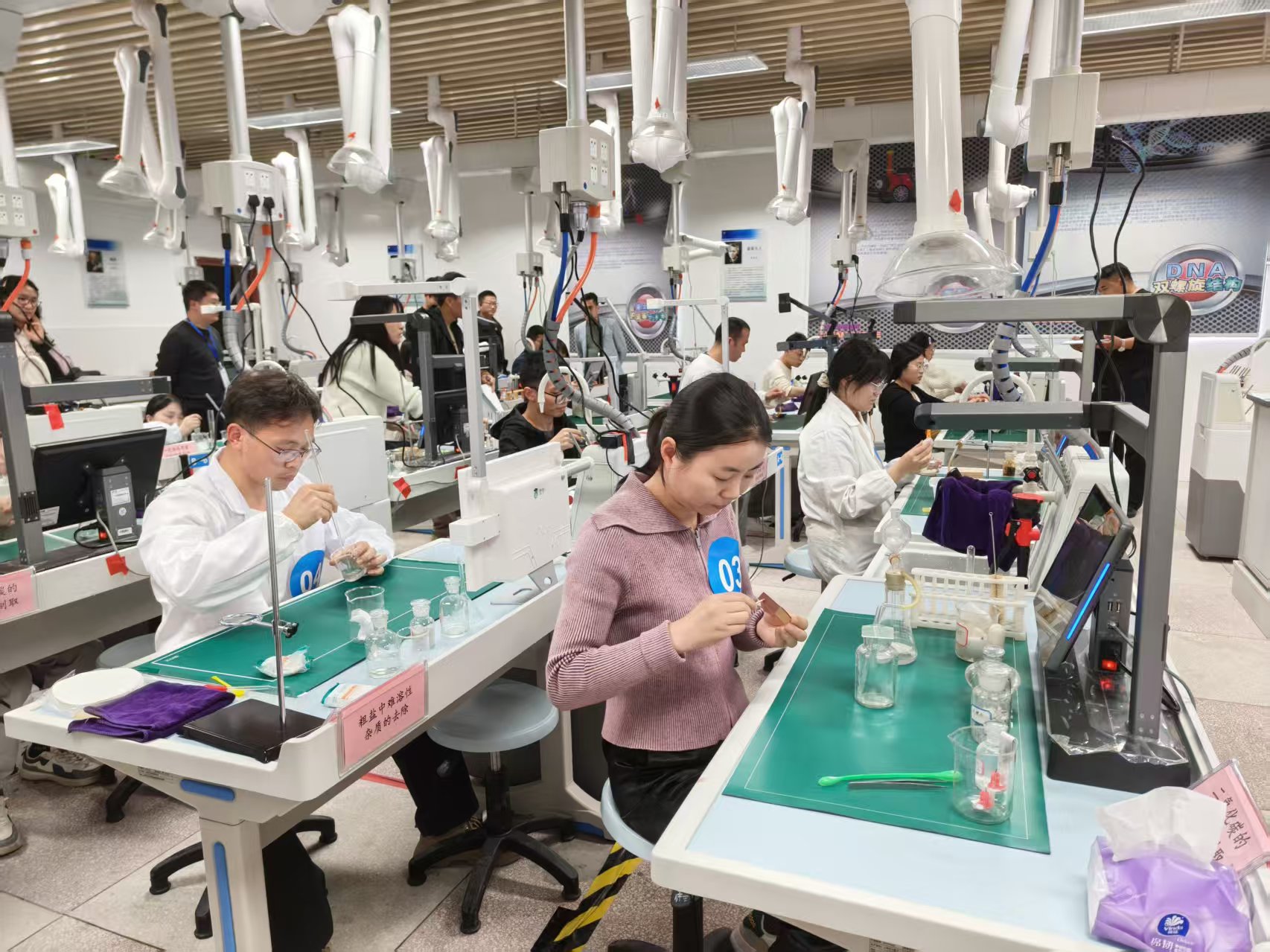 本次活动严格对标新课标要求,聚焦科学素养核心要素,设置理论知识线上答题与实验操作考核两大环节。线上答题依托专业平台进行,内容涵盖化学核心知识、教学理论、实验安全及创新设计等多个维度,全面考查教师的理论积淀与学科素养。实验操作环节创新引入AI智能评分系统,成为本次活动的一大亮点。参赛教师在标准化实验室中完成规定实验操作,多角度高清摄像设备实时记录每一个操作细节;AI系统则依据预设标准,对操作规范性、步骤精准度、安全意识以及实验结果等关键指标进行自动量化评分,真正实现了实验考核的数字化、标准化与智能化。